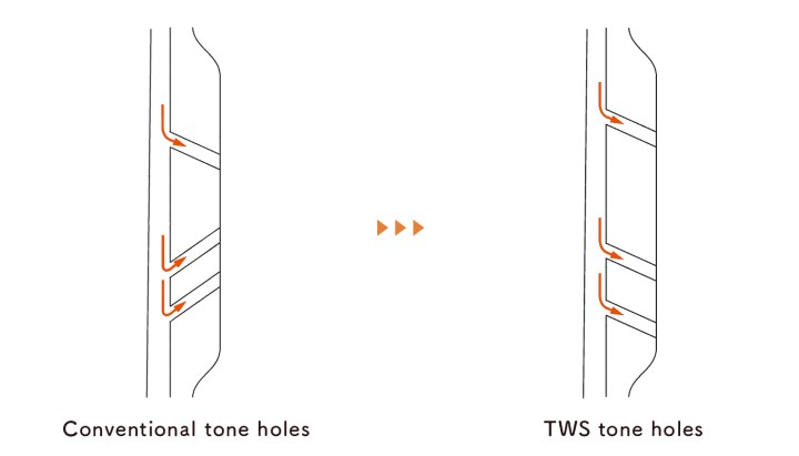 Their new system switches front tone holes 2 & 3 and makes them point up the bore. This ends the tone holes in a stretch too wide for a natural finger spread and so keys have been added.