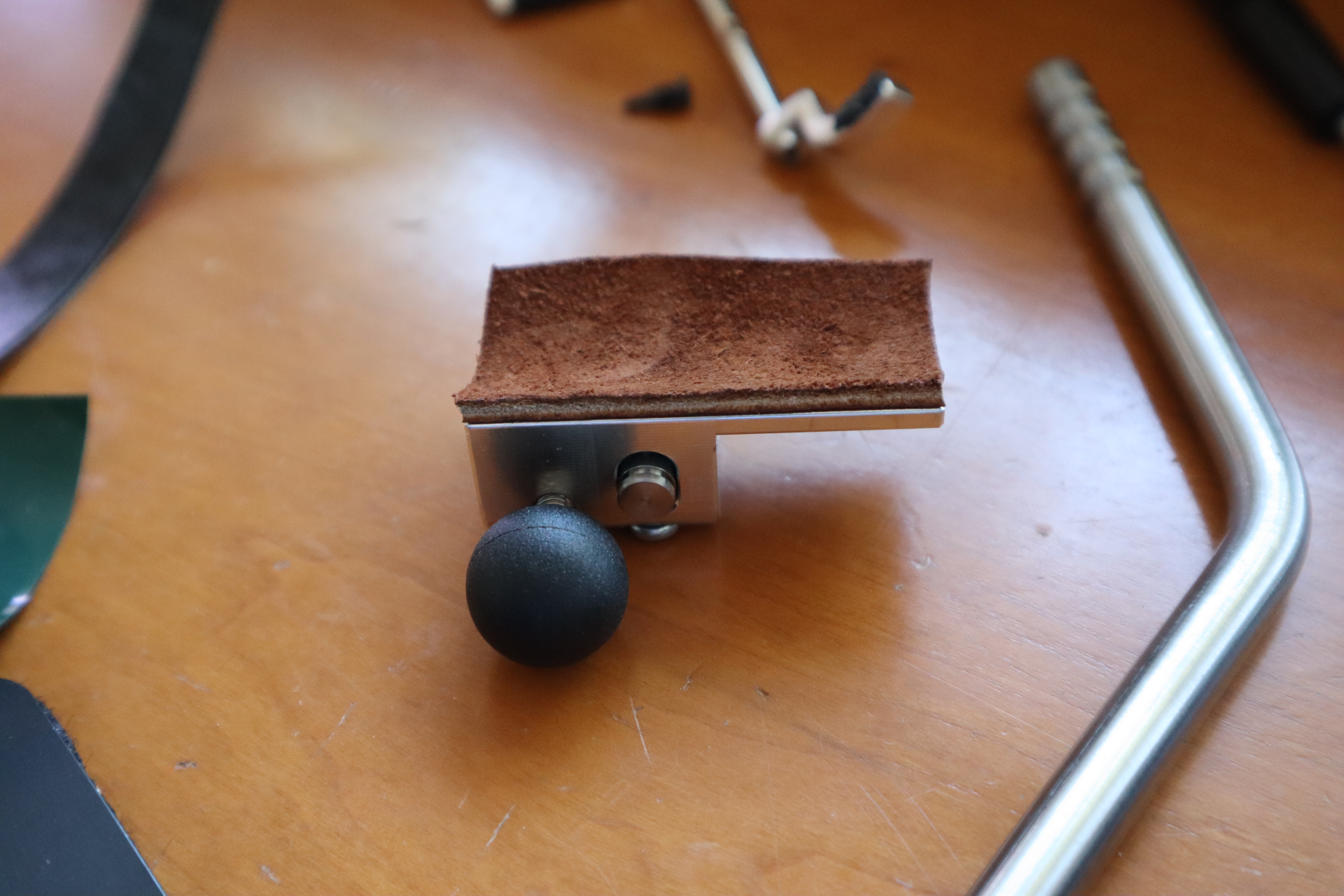 I glued on some leather to this block since it will have so much force rubbing against the side of the boot joint. After I realized that I have nothing to cut or drill the steel, I called Sean Gumin and he did great great job installing it. On Maartin Vonk’s website there is an in depth instruction manual which shows how to measure the length between the cuts and ideas for where to place the strap based on the player’s height.