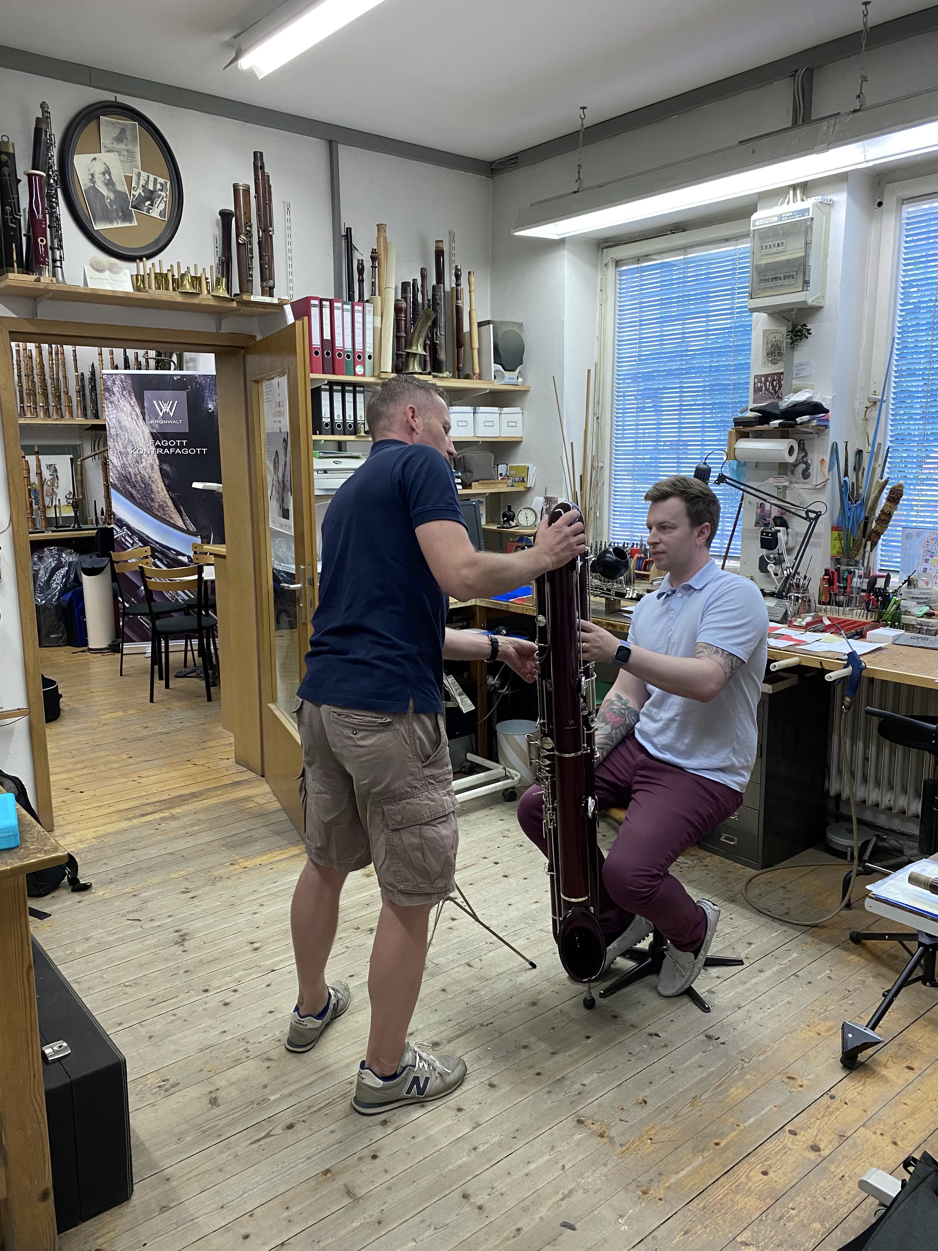 The side of the workshop is a room full of historic instruments, prototypes, and examples of current instruments being produced. I was surprised that there were so many pieces of lupophones around the shop, but I think they tried many versions before finalizing the design. And of course the Bassoforte was there which I have been so curious about, although it is dusty, there are recent finger prints on it. So someone had played it, or moved it. I decided not to ask to play it as I was taking so much of his time. Peter said that it doesn’t sound like a bassoon in any way, but it has it’s own voice. And there is not much function for it among bassoon players currently.