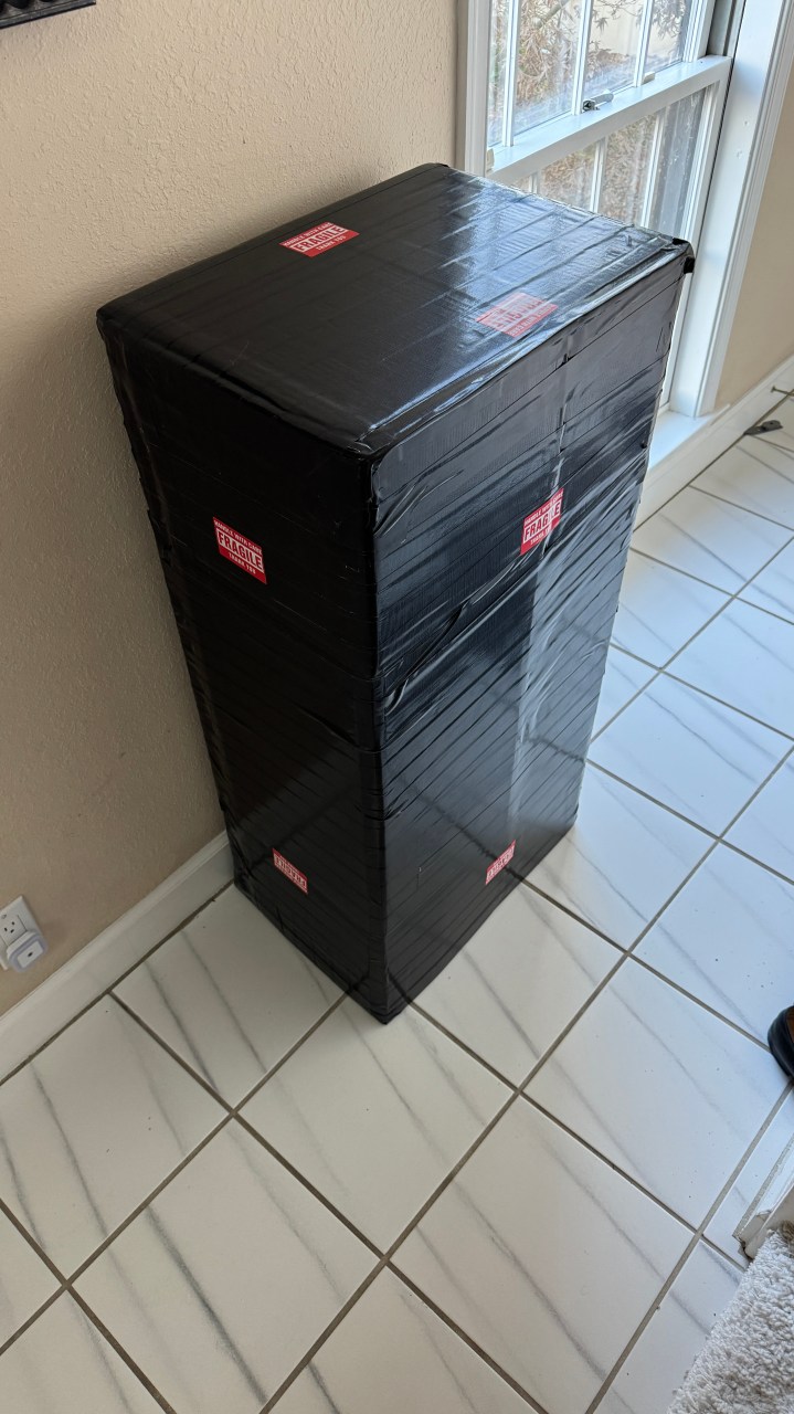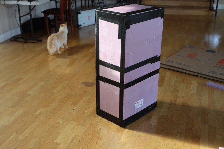 And Gorilla tape. Like most duct tape, it does a better job of sticking to itself than to anything else, so wrap around a complete loop aroound the box and onto itself. The end result of this is going to be a “tape monster” so I used 2 rolls.