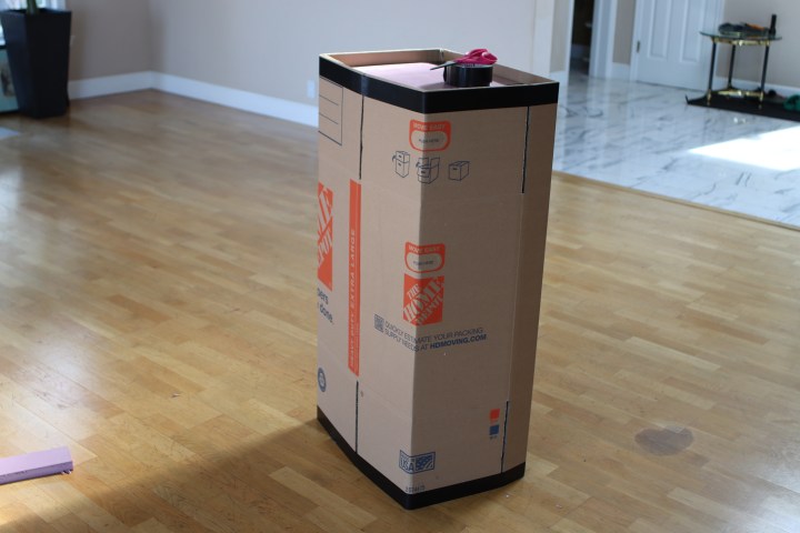Detached the box at its glued seam, and bent it around the outside of the foam. Pulled it tight and taped it.