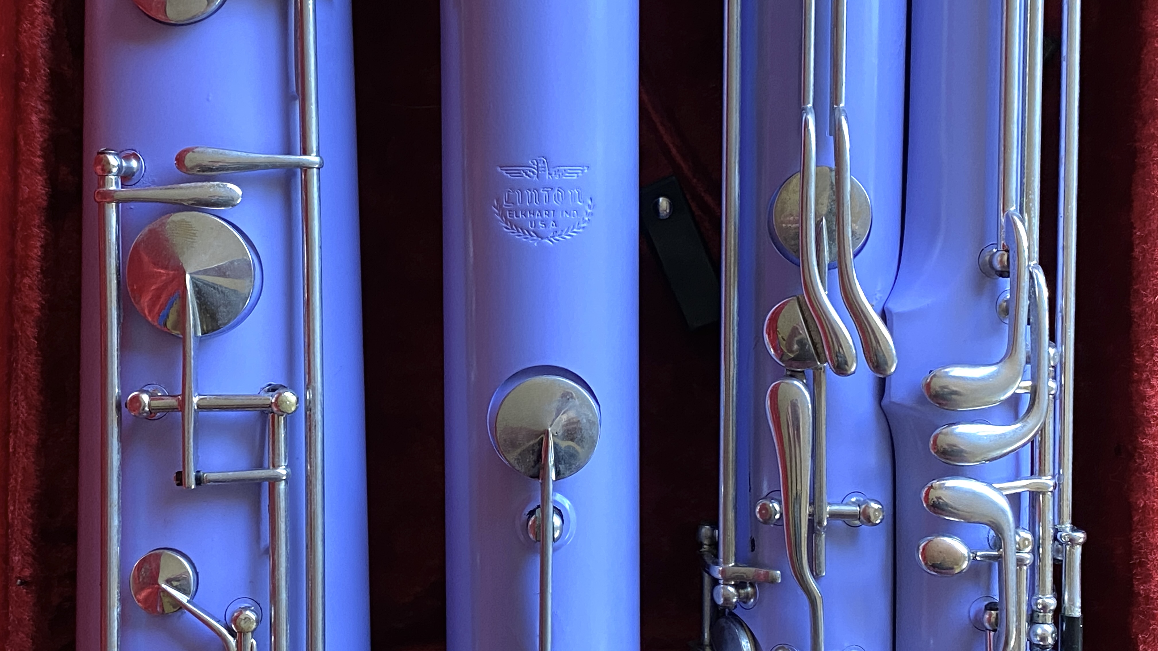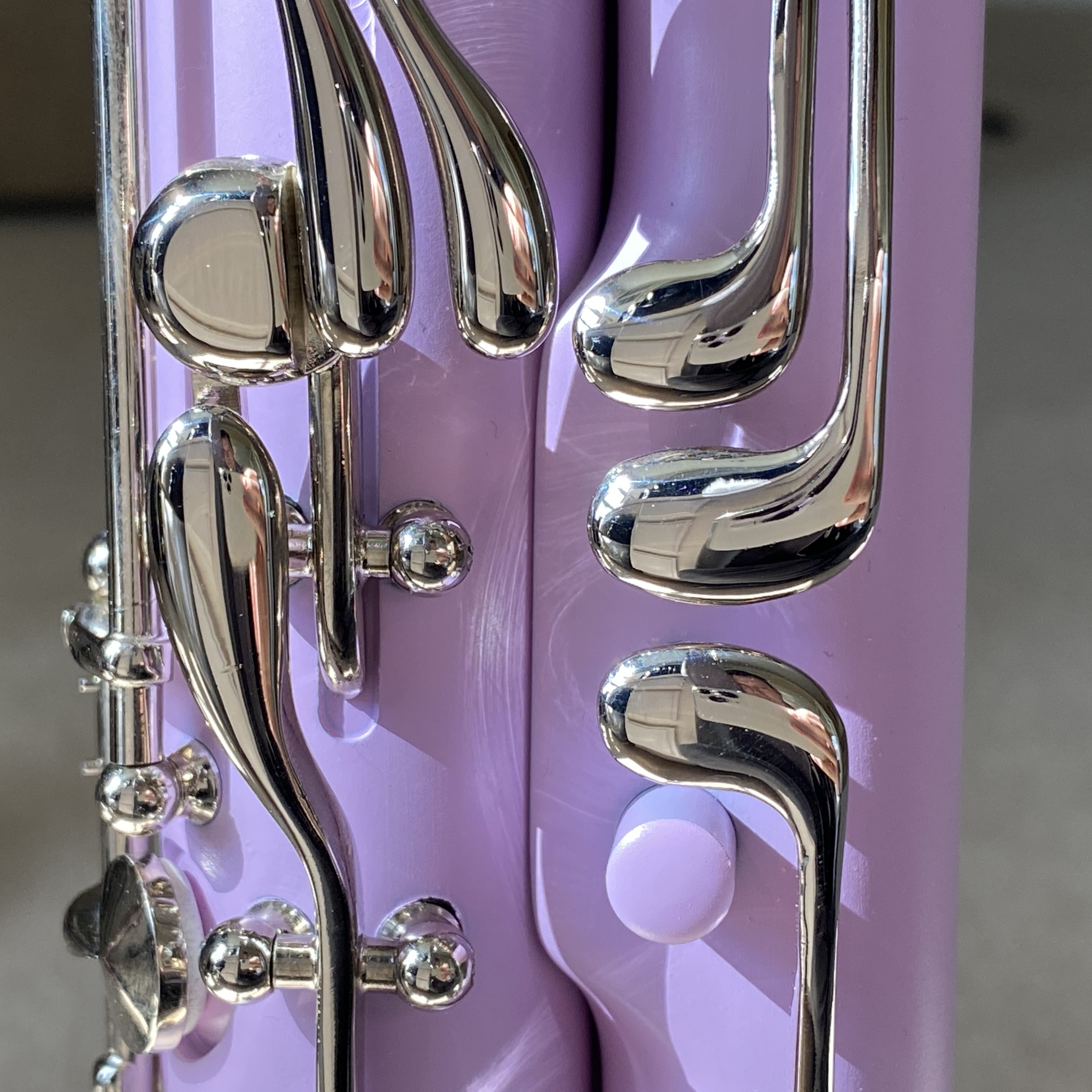 I painted it with a matte lilac spray paint and it came out great, so I decided to do my Linton bassoon also. My Linton sits in my closet now that I don’t teach, and I use it for outdoor evening gigs. For the Linton I used a darker lilac satin spray paint and the resulting finish has a bit more shine to it.